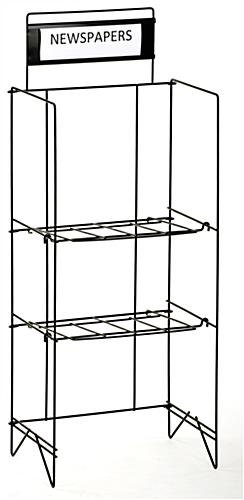 This metal newspaper rack will go great in any retail store, grocery store or supermarket. This literature stand features a 14″ x 4″ plate to hold information cards or labels. This metal newspaper rack that is adjustable is composed of wire frames and is very easy to assemble. With two different wire frame trays this display can hold large stacks of paper. At 46″ tall this metal newspaper rack is a great fit for users looking to conserve space at the office or store while still being able to sell literature. This stand is an affordable and economical option for business owners. This tall metal newspaper rack has a very sturdy wire frame.