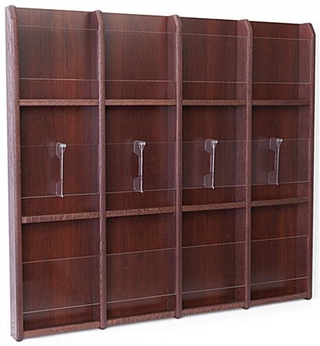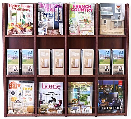 This 12 pocket magazine wall is excellent for supplying promotional literature as well as entertainment periodicals. Each literature rack is made of solid oak wood with a mahogany finish that looks great in waiting rooms and office lobbies. The open pocket magazine wall mount includes all necessary installation hardware for quick setup. The rack can hold either 8.5×11 catalogs or 4×9 brochures with the included slot dividers. Easily install the magazine mounts with their pre-drilled holes. Each unit includes all necessary mounting hardware as well.