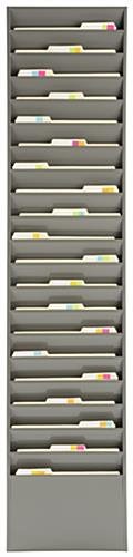 This wall pocket file holder with 20 tiers keeps letter size folders neat and organized. Made from powder coated steel, the chart holder resists rust and acid, resulting in long-lasting quality and durability. Each metal pocket file holder with gray finish can be suspended from cubicle partitions or office doors with the help of the HANGER- series sold on this site. The versatile, multi-tier design ensures that the holder has plenty of storage space for folders. Investing in an organizer that keeps letter size documents organized and easily accessible is a great way to increase productivity and efficiency. Institutions such as doctor’s offices, corporate lobbies, schools, and more can benefit from a pocket file. Many customers purchase multiple racks and use them together to create an information center for their place of business.