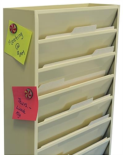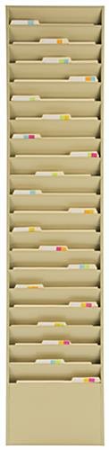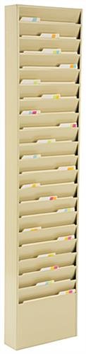 This metal wall mount file holder with a tan finish has 20 pockets for organizing large amounts of literature. Each storage rack is made of metal for practicality and durability. The file holder with a tan finish is designed to hold letter size folders. Many medical practices use the steel storage rack to hold patient charts and relevant medical information. With the help of the HANGER- series sold on this site, the metal file holder can also be hung over a cubicle divider or office partition. Multiple pockets provide plenty of space to organize incoming mail, memos, clientele files, and more. A steel construction with a tan power coated finish ensures that the unit will last for years to come.