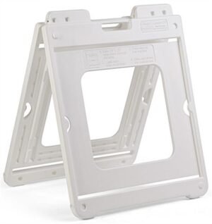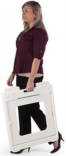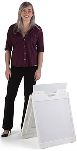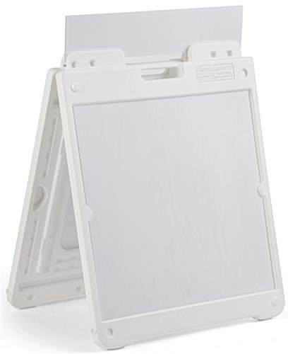 Suitable for indoor or outdoor use, this 20 x 20 sandwich board will help your business stand out! The double sided frame accommodates 2 Coroplast® poster inserts and a header, which are included with this unit. Easy to write or print on, the panels allow you to customize your graphics on this white sandwich board for an effective sidewalk display. The plastic design is both durable and lightweight for long-term resistance to rust and weather-related damage while light enough to carry with the built-in handle. With non-slip feet and plugs to fill the frame with sand, this durable double sided display remains stable on a bumpy sidewalk or windy days. Add this sandwich board to your outdoor signage for advertising your business or upcoming promotions!