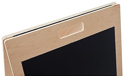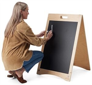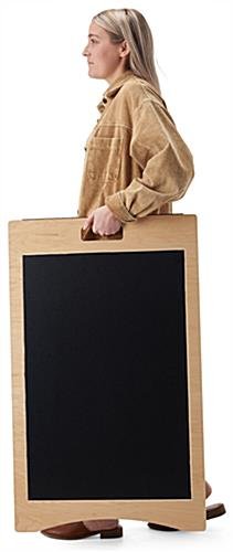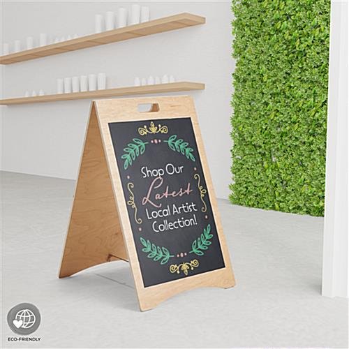 Our a-frame chalkboard has a minimalistic design made of eco-friendly FSC® certified poplar wood, adding a natural touch to any business space. This wooden sign is a great way to advertise menu specials, retail promotions, and event signage in your restaurant, boutique, farm stand, or trade show. Our eco-friendly a-frame chalkboard features a collapsible design and cutout handles, allowing for easy transport for users. This sign is double-sided, with both sides featuring a 20″w x 30″h vinyl write-on material compatible with standard and liquid chalk! Use a damp microfiber cloth for best results when wiping off your advertising messages. This unit ships fully assembled, allowing you to get up and running quickly upon arrival. Our poplar wood a-frame chalkboard is a sleek and modern way to showcase your monthly specials, event messaging, etc. Use this eco-friendly sign over and over again for years to come!