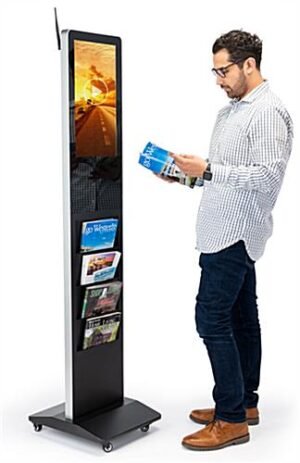 Our magazine rack digital display system with integrated DisplayIt!Xpress software is an all-in-one advertising solution. The content management system allows you to push content from any computer to the literature stand for easy media video player control. This magazine rack digital display system includes 8GB of internal storage and can play vivid HD content, audio files, slideshows and PowerPoint presentations. The content video player is capable of scheduling marketing digital campaigns, displaying RSS feeds, widgets, monitoring event logs and communicating emergency broadcasts. Included with your purchase is lifetime tech support from DisplayIt!Xpress technicians and a 1-year limited warranty. Complete with Android OS, WIFI capability and Bluetooth connectivity, the magazine rack digital display system allows you to download apps, browse the web and even print documents. Designed with elegance in mind, the media digital literature stand features a modern and slim design constructed with high-quality metal. Complete with 4 removable smooth gliding wheels for easy mobility, placing your digital signage in its optimal position will be quick and easy. The HD player with 178°/178° viewing angle, 1100:1 contrast ratio, 500-nits brightness and dual 10W speakers will entice your clientele to pick up literature from the (4) deep pockets. The vibrant 21.5” HD resolution screen is extremely responsive via remote control and includes a protective tempered glass faceplate for durability. Sell advertising spots to local businesses and turn your waiting room into a profit center, use it to display menus or to let your customers know about upcoming marketing promotions. Bring your reading materials to life and grab the attention of anyone who walks into your business with this completely customizable media zone that will look amazing in your trade show booth, waiting room, restaurant lobby or shopping mall.