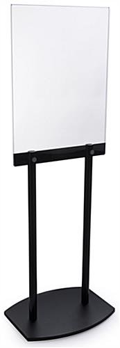 Floor Display – This acrylic floor display for posters holds (2) 22″ x 28″ posters for double-sided viewing. Base, legs and accent strip (below clear poster frame) are all black. Easy assembly, all hardware provided for this floor standing sign holder. Base measures 24″ wide by 18″ deep. Also available with pocket brochure holder attachment and custom header panel. Overall height of unit is 67″. Similar clear acrylic poster floor display offered, see related items below.