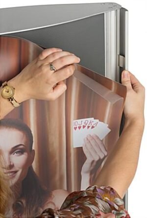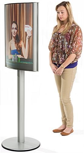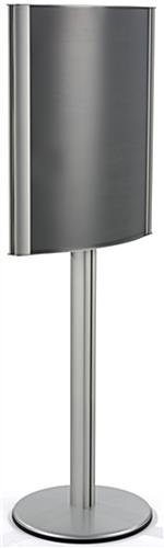 Try this curved 22 x 28 poster stand for a heavy duty display that features a modern design to attract viewers. While the sign holder has become a staple of any successful business, this snap frame forgoes tradition with a sleek convex design for easier viewing at any angle. As part of its modern design, the silver poster stand is constructed with heavy duty aluminum for long-term use but evokes elegance with a brushed finish. Designed for ease of use, the double sided frame smoothly snaps open to quickly load new graphics without needing to disassemble or tip the unit. In fact, this high quality holder is resistant to toppling with a weighted steel base for use in busy lobbies or large trade shows. Easy to assemble and even easier to load with custom signs, this poster stand effectively advertises without wasting time or money.