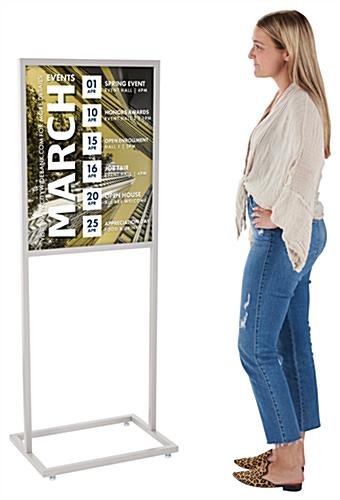 These sign frames are the most cost-effective way to showcase your posters. The sign frames can be double-sided, maximizing your graphic exposure. These sign display holders feature a top-loading design, great for fast graphic changes. When printing your graphics, we recommend the use of thicker poster materials, as we do not include the sign frames with plastic lenses or backers. Unlike our MFPH1BLK series (see related products below), posters are held in place only by the grooves in the frame. The graphic slot measures ¼” deep. We do, however, include the sign frames with 4 adjustable levelers for use on uneven floors. The poster stands are shipped unassembled, but are easily assembled with minimal effort. The tools necessary for assembly are included as well.