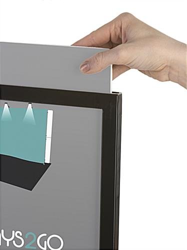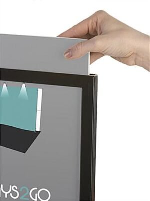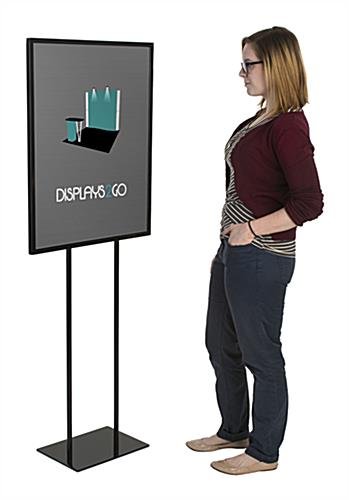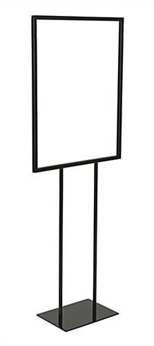 This 22” x 28” steel poster stand, finished with a glossy black coating, is a staple for businesses looking for a versatile and practical way to catch the eye of any consumer. This metal display hits the sweet spot when it comes to frame size and appearance, particularly for those trying to attract interest in high traffic areas like retail stores or trade shows. This sign holder poster stand is large enough to get noticed but small enough to function in locations of varying size. Though this floor display is manufactured with a metal frame for durability, it’s still lightweight enough to be moved and repositioned with ease. For those making quick changes, this poster stand’s top-loading frame makes the process fast, easy, and hassle free. Adding to its functionality, this sign holder’s double-sided display is great for boosting your visibility – no matter where you position it on the floor.