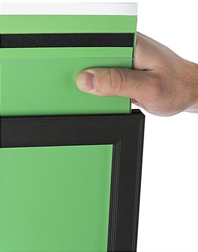 This black 22 x 28 wheeled poster stand is the perfect signage holder for all your graphics! The sign features a double sided display frame to advertise two visuals at once. Each mobile poster stand has a floor standing design with two wheels for mobility. The graphics holder includes a high impact polystyrene support with two non-glare lenses to ensure great readability from all angles. Metal display frame construction and a glossy powder finish provide a polished look. Use the poster stand to advertise and promote merchandise during large trade show events or in a store front for instant product exposure.