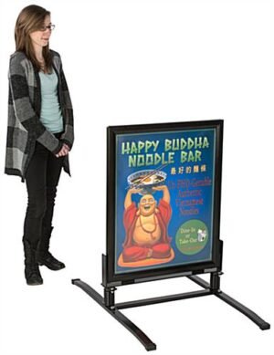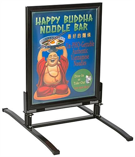 This outdoor sign stand is a sturdy and reliable option for a sidewalk poster display. The powder coated steel springboard base is anodized so it will not rust, making it a great fixture for advertising outside. Use the double-sided black sign stand to hold two 22” x 28” posters safely in place with a reliable snap frame construction. Interchanging your graphics is easy, allowing you to diversify your outside display whenever you’d like. The sign stand’s snap frame has a magnetic strip lining the interior, which holds a non-glare PVC lens in place to keep your graphics protected from inclement weather conditions such as wind and rain. Advertise outside without fear of weather damage to your marketing material by using this sturdy sidewalk poster holder.
