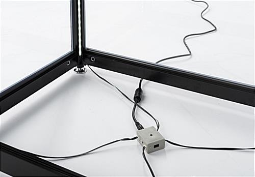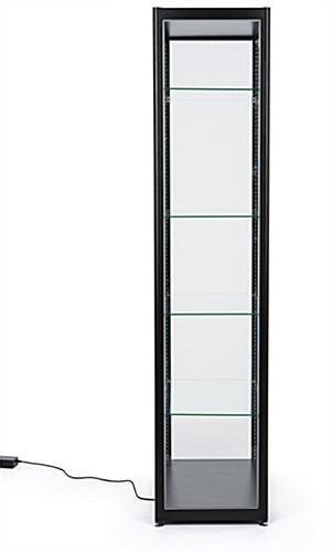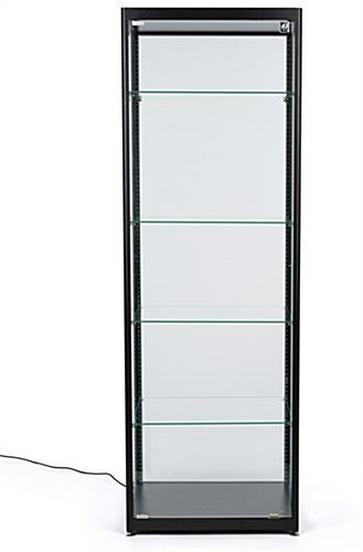 Use this black glass curio display cabinet as a trophy case for your professional accomplishments or to store and show off high-end merchandise in contemporary style. The adjustable shelves allow for fine tuning to find just the right height for your valuables. LED strips are set into the corners of this aluminum and glass curio display cabinet and illuminate the delicate details of anything stored within. A lock on the front helps to keep valuables safe, while still allowing quick access. The case arrives unassembled. Pick up this curio display cabinet to showcase your personal collection or store merchandise today!