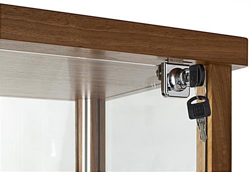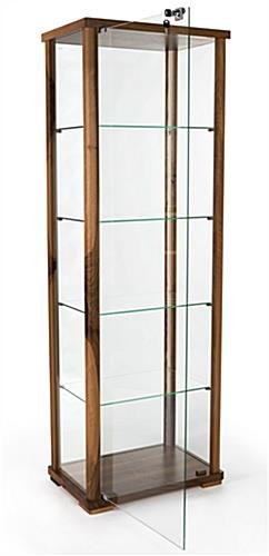 This full glass narrow display case with subtle wood framing gorgeously exhibits a variety of items like jewelry, fine dishware, and even action figures. The swing open door is lockable, giving you peace of mind in knowing that your valuables are secure. This walnut wood glass narrow display case allows enclosed items to be viewed from all four sides, so it can be placed in the center of a room if desired. Whether you’re showing off something as small as jewelry, or a little larger like action figures, the adjustable shelves can be moved up and down easily to accommodate. The entire unit ships unassembled to make it easier to place in your home or business. This narrow display case is a beautiful, subtle way to show off the things you’re proud of.