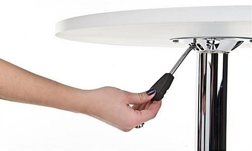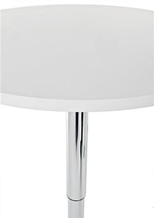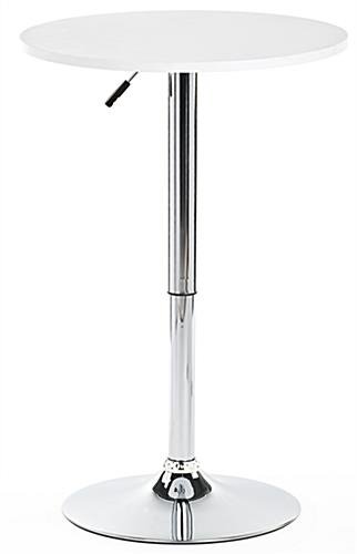 This dinette is a great alternative to conventional sit-down dinner service. This chrome finished white bar table provides a casual setting for guests to mingle. This pedestal will look great in any booth during an exhibition, convention, or other special events! Display company or product information and arrange stools around the white bar table that is for trade shows to ring in guests for networking. What’s more is this tabletop is lightweight and portable to easily transport to different venues or move around a room for different displays. This white bar table, called event furniture, is adjustable. Height can be modified by a pneumatic lift and alternate between 27” and 36” tall. This White bar table that is counter or pub height can also spin 360° to display different products or information on either side without having guests move around the counter. Pair this round tabletop with a couple of high top stools found on this site to give a warm charm to event displays!