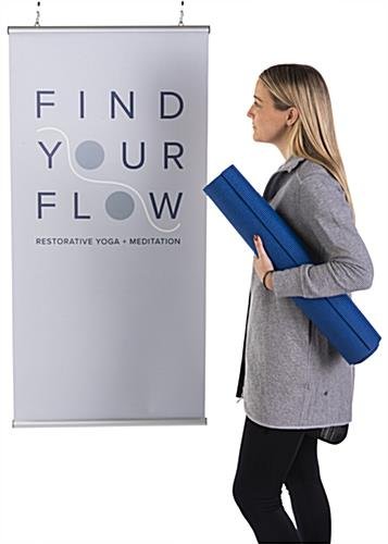 Poster hangers, banner rails, and sign hangers show your customers the way to the sales promotions. The modern, aluminum profile of this sleek poster holder will fit in well with any design environment. Use all that ceiling space up there! Buy a poster hanger today and start realizing the benefits of hanging poster advertising.