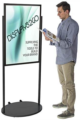 Featuring a glossy powder coated finish, this black 24 x 36 poster stand with wheels is the ideal sign holder for your storefront! The floor standing, double-sided display is the perfect advertising for a trade show or convention. The poster stand comes equipped with an oval metal base with rear hidden casters and a light aluminum finish for easy maneuvering from the sidewalk or to a preferred indoor placement. Also sporting a top slot-loading design, the frame holder comes with 2 clear non-glare lenses and a frame support to protect your graphics from dust, finger prints, or scratches. The poster stand comes with very little hardware, making for easy assembly by simply attaching the base to the frame. Use the ad display to promote your products at a tradeshow or by placing the unit on sunny days on the sidewalk to promote your business!