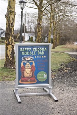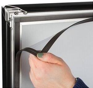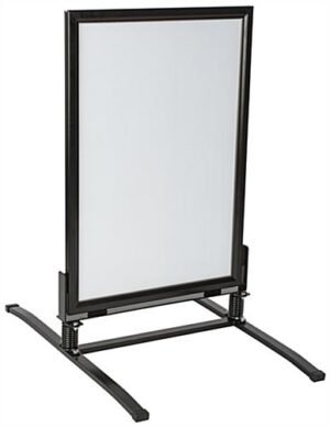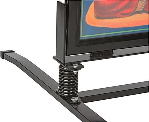 Use this springer sidewalk sign to display your own graphics outdoors without fear of them being ruined by moderately inclement weather. With a sturdy steel springboard base, this changeable message board is steadfast in windy conditions and accommodates two deluxe 24” x 36” posters. The double-sided sidewalk sign has a sturdy steel snap frame with magnetic lining inside; this lining attaches to the magnets that surround a thin PVC lens. The PVC lens is anti-glare and closes the graphics posters off from any moisture that may be encountered via rain or other outdoor weather conditions. Using a sidewalk sign will draw attention to your deluxe and informative marketing material. If you are looking for a durable, but aesthetically pleasing curb-side advertising solution that will keep your posters dry, look no further than this reasonably priced, weather-resistant message board.