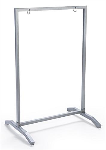 This 24×36 silver swinging sidewalk hanging frame is a durable for outdoor use. Each sign holder with a weighted t-base stands firm throughout windy conditions. Ring hooks attach a poster panel to the open swinging sidewalk hanging frame. Position the durable sign holder on the pavement outside of your business. Poster panels are sold separately to complete the sidewalk hanging frame. Place the sign holder curbside to attract attention and complete your advertising needs.