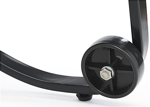 Whether you need a classic a-frame poster holder or a write-on surface, this chalkboard display fixture sandwich board can serve either need! Each side of the pavement sign can showcase a 24” x 36” image or a personalized hand drawn message on the writing area. A magnetic PVC lens snaps firmly around the edges of the a-frame display fixture sandwich board to keep your advertising safe indoors or outdoors. Two wheels on the base of the pavement sign make it easy to roll outside your store, restaurant, or bar. Powder coated steel provides durability without sacrificing a modern style that will last for years to come. Promote restaurant specials, new hours, or advertising on a colorful poster or hand drawn message with this sandwich board that supports dual usage.