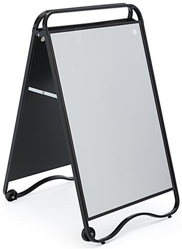Ideal for indoor or outdoor environments and multiple uses, this double-sided write on poster sidewalk fixture is a versatile advertising board. Able to accommodate two 24” x 36” graphics or hand written messages, the dual design offers the chance to mix up your artwork in a flash. Each wheeled write on poster sidewalk fixture has two casters that allow for easy portability by simply tilting the board back and pushing it to a desired location. A magnetized PVC lens snaps firmly around the edges of the frame to protect your messages indoors and out. Use colorful markers and drawings on the dual design to showcase special events or business information to passersby in a fun and interactive way. Complete your advertising arsenal with this sidewalk fixture which can help promote your company and set you apart from the rest.