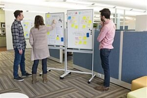 Whether used as a Kanban board, for Scrum, or in another Agile workflow management process, this portable whiteboard is a key visualization tool for your team. With a two-sided magnetic writing surface and locking wheels, this dry-erase board has been designed with mobility and versatility in mind. This heavy-duty whiteboard is constructed from painted steel and aluminum, making it ideal for everyday work. Use it as a Kanban board on one surface, flip over and brainstorm on the other, all while keeping your notes and visual aids attached to the magnetic face. If office space is tight, then mobility in your visualization tools is key. Plus, the one-touch board lock means no time lost fiddling with knobs or temperamental toggles. Keep your team on task, your project on track, and your workspace tidy and efficient with this whiteboard.