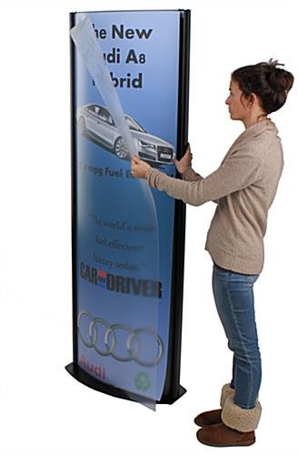 These print holders are designed for (2) 24″ x 72″ graphics. With this totem sign stand that showcases large prints, customers are much more likely to take notice. The black semi-gloss finish on these displays really stands out and meshes well with and décor. This totem sign stand that is curved also features a grey PVC backing to ensure prints appear wrinkle free. The door on these sign holders swing open to quickly access signage. This 6′ totem sign stand is a great advertising tool to draw attention towards a business or store. The clear lens will protect any prints from damage. This totem sign stand that is 6′ tall provides a welcome alternative to the same old rectangular sign stands usually found in POP settings!