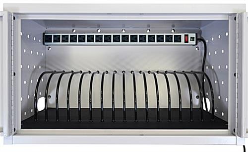 This laptop security cabinet integrates tablet storage and charging to keep your school or office up and running at all times. It can be used as a wall mount with the included hardware or can compactly sit on a desk or countertop. This locking laptop cabinet has small holes in the steel frame to allow air to circulate and keep electronics from overheating while in storage. The interior is padded and the dividers are rubber coated to greatly reduce chances of the locked up tablets getting damaged. There is a horizontal 120V/15A power strip outlet with 16 plugs located inside to keep devices charging while it is safe under the included lock and key. This laptop cabinet can hold up to 75lbs as a wall mount, making it ideal for busy offices and schools.