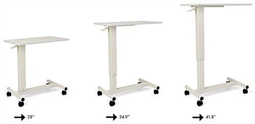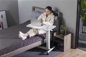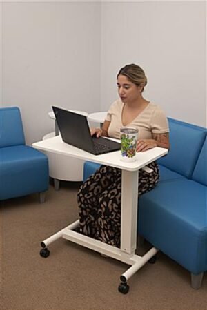 This overbed bedside table with wheels is height adjustable ranging from 28″-41.8″, excellent for standing, sitting, or lying while working at home, in medical centers, government agencies, non-profit offices, or home-schooling. The modern workstation features four heavy-duty casters that can easily lock in place when in use and quickly unlock when needing to be moved. Our ergonomic mobile overbed bedside table with wheels offers the perfect amount of working space to fit your laptop, computer mouse, and writing tools. Also included is a built-in cup holder, ideal for keeping your drink away from the workspace. This mobile workstation can easily and quickly be height adjustable with the gas-assist lever located underneath the side of the stand, ideal for rolling under or over a bed or chair. The durable steel construction can hold a max weight capacity of 15.4lbs, ideal for carrying everything you need for work and school. Turn any space in your house into a comfortable and productive home office with the ergonomic overbed bedside table with wheels.