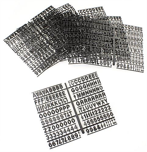 menu display. The black characters are easiest to view when used on top of a white background. These sign letters, also known as replacement menu board inserts, include tabs to easily insert your characters into letterboard channels. The changeable numerals include 6 sheets of numbers, symbols and all of the ABCs. The set includes 900 characters! These sign letters can be used on a variety of menu boards and message displays. The tabbed characters kit has more vowels and primary consonants. (Please view the PDF document linked below for actual counts.) These sign letters are made from injection molded plastic.