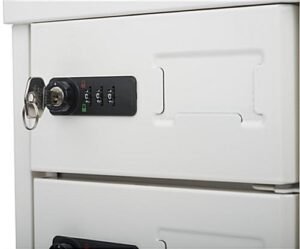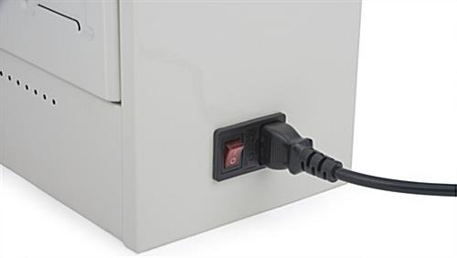 Complete with individual combo lock doors, multi-head cables, and charging indicator lights, this mobile device locker is a complete charging storage solution. Eight small compartments fit phones and small media players while two large sections offer plenty of space for tablets. Each device locker with programmable combo pad allows users to keep the same code or change to a new one whenever necessary. Open the storage solution doors to find a multi-head cable complete with adapters for micro-USB, lightning, or 30-pin connectors. An included set of keys allows the owner to open the back and front compartment locks so you never have to worry about forgetting your code. This device locker is great for letting people charge their phones or tablets in schools, stores, hotels, and more!