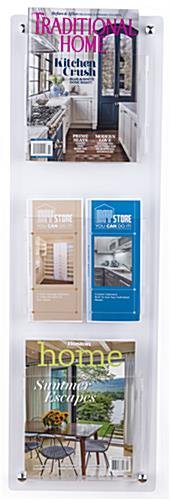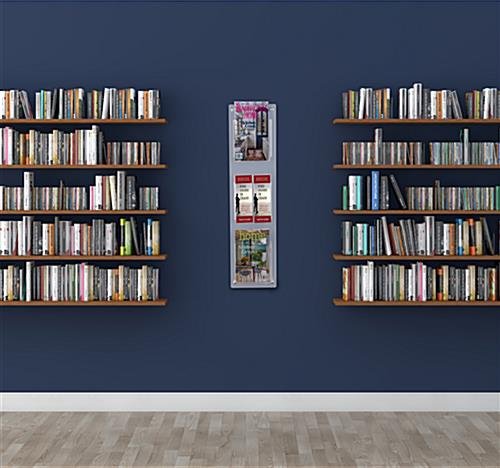 This 3-tier wall mounted literature rack has optional 3 clear acrylic dividers that make 6 pockets, excellent for holding magazines and brochures at travel information centers, banks, retail stores, waiting rooms, and more. The modern catalog holder includes a set of 4 stainless steel standoffs, adding a stylish touch to your office space. Use our clear 3-tier wall mounted literature rack to keep your magazines and brochures organized and readily available for travelers, waiting customers, and patients. This easy-to-install catalog display is made exclusively in the USA. The 4″ x 9″ transparent acrylic pocket dividers are perfect for keeping catalogs and folded brochures wrinkle-free and from falling out of place. Our sleek 3-tier wall mounted literature rack ships with pre-drilled holes, making installation effortless in any school, church, hospital, senior center, and more.