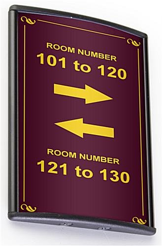 This office directory, wall sign is an inexpensive way to provide your office or business with wayfinding signage. Constructed from anodized aluminum, this name holder is durable for many years of use. This wall sign has a unique, curved design to draw the attention of visitors and customers. Featuring a sleek black finish, this metal frame can easily coordinate with any office or business setting. This wall sign can make your work setting look more professional, by identifying offices or cubicles. The product can also be used as a wayfinding signholder, directing customers or new employees to the right area as well.