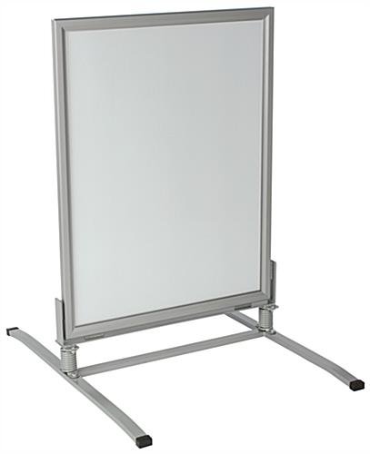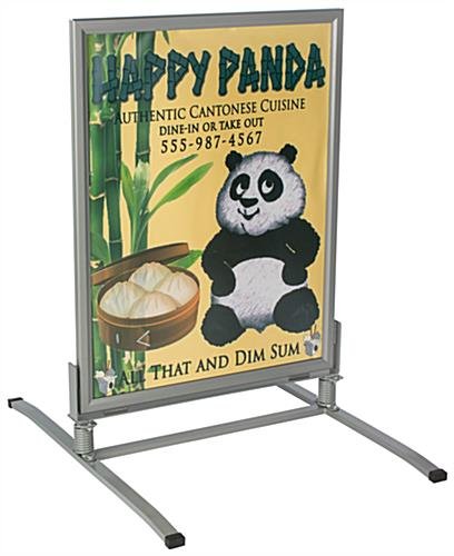 This weatherproof sandwich board can be used to display your advertising material outdoors, no matter what the weather conditions may be. If you’re in the market for a durable sidewalk sign, this product is right up your alley. The silver sandwich board has a powder coated steel construction with a sturdy springboard base that will flex but remain steadfast during windy conditions. The double sided snap frame provides front loading of your graphics and has anti-glare PVC lenses with magnetic lining that attaches to the corresponding magnetic trim on the interior of the enclosure. Place this sandwich board inside or outdoors and rest assured that the snap frame’s durable construction will keep your display materials safe from most inclement weather. Bad weather deters foot traffic for most venues, but these sidewalk signs will give you the advantage of letting passersby know you’re open-regardless of the weather conditions!