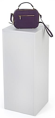 This white display cube was constructed of particle board with a durable semi-gloss melamine laminate for a stylish finish. This retail floor pedestal was created with a collapsible build to ship flat and store neatly when not in use. The sleek white display has a laminated surface for that shiny upscale look you’re seeking to promote clothes, shoes, purses, jewelry, books or even sculptures! Included with the floor pedestal are 16 cam locks, 16 cam posts and 8 wooden dowels for assembly. Utilize this cube in any retail environment because of its durable, scratch and shatter resistant build. The unit is 30” tall with a 12.5” wide top surface and a 130lb weight capacity, allowing you to draw attention to even those heavier items.