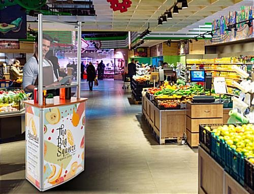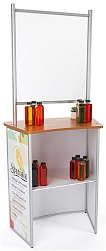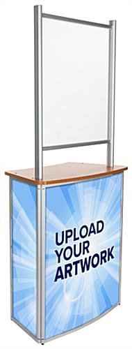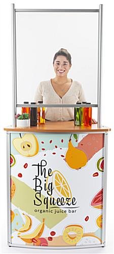 This personalized commercial table with splash shield comes with a brown countertop and 3-panel adhesive graphics printed with full-color options, allowing you to be creative in promoting your products and services. The included height-adjustable transparent sneeze guard facilitates safe customer interactions while stopping the spread of germs at trade shows, supermarkets, doctor’s offices, reception areas, and more. Use our portable, personalized commercial table with splash shield and carry case to quickly move from one event to the next to provide personal protection against aerosol-based viruses while advertising your business.