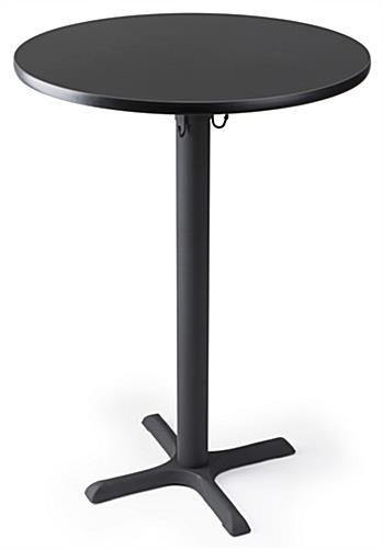 This black bar table makes a great addition to your furniture overhaul, whether in a restaurant, café, or company breakroom. Tall 42-inch pub style height allows each dining fixture to pair well with a stool set, while also fostering a relaxed atmosphere. This convenient bar table comes with cast iron hooks that can be clamped to the column base and used for hanging bags and purses. The laminate finish top is easy to clean and can work well alongside an existing furniture arrangement, like a chair or stool set. Screw-in levelers on the base prevent the tabletop from becoming wobbly or uneven. With its pub style design and durable features this bar table is the ideal balance of form and function.
