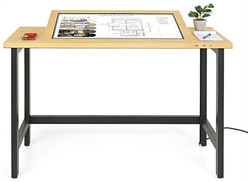 Our interactive multi-touch table has a beautiful faux wood grain finish, bringing a sleek and warm aesthetic to your business space. This digital desk also features a wireless charging pad on the left side, conveniently allowing you to charge your smartphone and devices as you work. This 32″ interactive touch table has an Android 7.1 operating system and access to Google Play so you can download all the apps you need for your business. Each unit also comes with our DiViEX SlideShow app that allows you to edit and format your digital content in minutes! This modern kiosk has a 30-degree slant for the perfect viewing angle when used either sitting or standing. This digital desk is ideal for designers, architects, students or business professionals looking for the perfect collaboration device! The wireless charging feature on this kiosk has a 15-watt output allowing for speed and efficiency when you charge your devices. This wood grain interactive touch table will add a unique element to your store, studio, or educational space, allowing you to digitalize your daily business activities.