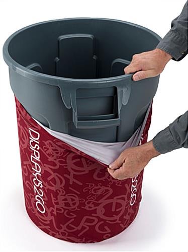 This printed 32-gal trash barrel cover is made of a spandex material that will contour fit to your trashcans. Each garbage can wrap is fully customizable and fits most standard thirty-two gallon receptacles. The contour fit printed trash barrel cover is great for additional advertising or just dressing up a boring bin. The spandex material has full graphics that are customizable to your needs. Each trash barrel cover keeps unsightly trashcans concealed while offering advertising in a unique low profile way. This full graphics contour fit receptacle wrap will transform your event.