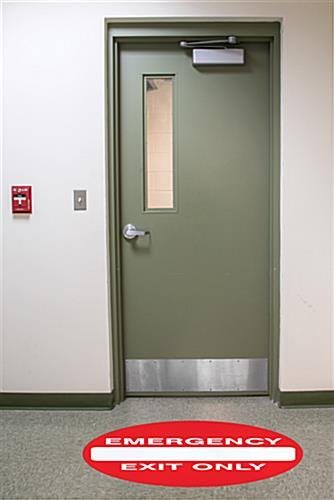 Use this emergency exit anti-slip floor sign to improve occupational safety in the workplace and provide clear demarcation or warning depending on the location. The vinyl decal has an adhesive backer than can be applied on a variety of surfaces, including wood, tile, and concrete, and features an impressive 36” diameter to ensure visibility. Each circular floor sign is designed for warning employees about potential occupational safety concerns and can withstand up to 3 months of foot traffic.