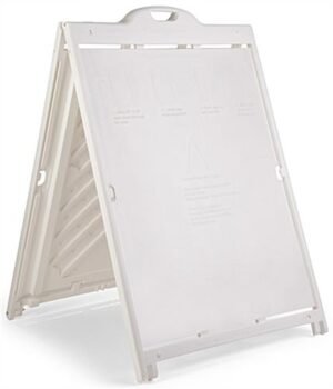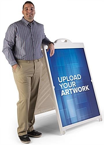 Available with full color printed Coroplast® inserts that are larger than life, this custom 36 x 48 sandwich board is a great choice for outdoor advertising. The double sided frame makes sure that your graphics are seen by passing pedestrians, while the UV printing captivates with intense shades and tints. While this large sandwich board might seem heavy, each unit is made with lightweight plastic and is available with both wheels and a handle for convenient mobility. When you set up this double sided display, the full color inserts securely slide through the top of the frame and remain in place due to the built-in Stay Tabs. For maximum stability, this unit can be weighted with sand to withstand heavy crowds and windy weather. Make the most of your outdoor promotions with stunning graphics paired with the impressive size of this sandwich board!