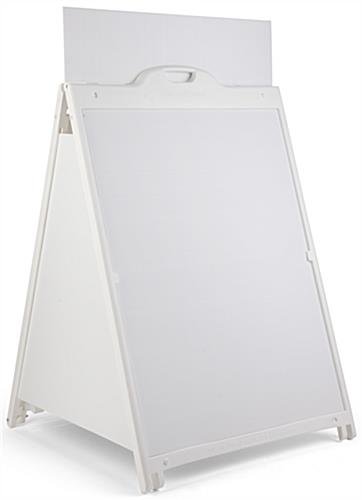 For an eye-catching display frame this 36 x 48 sidewalk sign with inserts is the perfect fit! These sandwich boards feature 360° advertising, using changeable poster panels, triangle sides, and a header to captivate passing pedestrians. Arriving with white Coroplast®, the double sided sidewalk sign provides the basics so you can print and customize for upcoming sales, new products, or promoting your business in general. When you’re setting up the changeable posters easily slide through the top of the frame and stay in place with secure stay tabs. Despite their impressive display size, these sandwich boards are lightweight and include wheels and a handle for easy transport inside and out. If you’re expecting a windy day, the base can be weighted with up to 6lbs of sand. Try this sidewalk sign to draw in potential customers and stand out from your competitors!