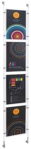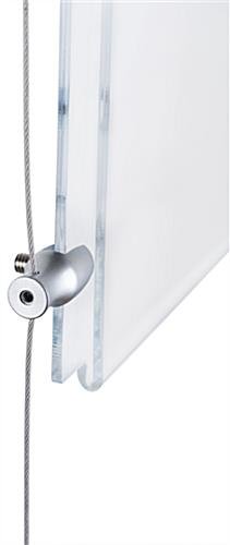This suspended sign kit, also known as cable displays, is perfect for businesses looking for relatively low cost signage that grabs the attention of the customer. This kit includes custom designed satin silver finished hardware for an elegant look to blend well with any environment. This suspended signage kit, suspended sign kit includes a crystal clear acrylic panel with a simple to use top-insert design. Users can quickly switch out marketing materials according to business needs. This suspended sign kit is part of a large selection of cable kits in all different sizes and configurations. Purchasers can choose a pre-designed set or create a unique matrix by combining multiple different kits.