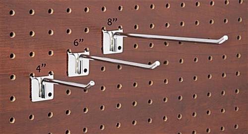 These chrome 4″ retail peg hooks are crafted from durable metal and feature a powder coated finish. The 4” hangers are perfect for storage and organizing a wide variety of tools, painting supplies, crafts and a host of other items to create enticing retail displays. Turn your walls into an effective merchandise space with these retail peg hooks.The strong steel wire construction will keep these hanger accessories functional for years. Fits all types of 1/4” pegboard with 1” spacing. These chrome peg hooks are a simple and effective way to create functional organized merchandise spaces and retail displays.