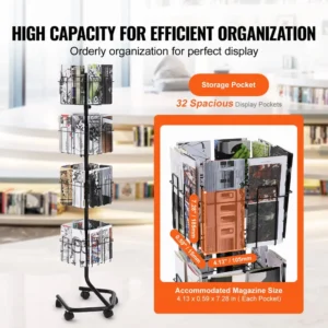 - 360° Spinning Display, Easier Viewing: VEVOR’s rotating document display rack offers an innovative approach to showcasing your files. Its unique 360° rotation enhances visibility from multiple angles, making accessing your brochures easier. No need to flip back and forth—simply rotate the display 360 degrees for efficient displaying!