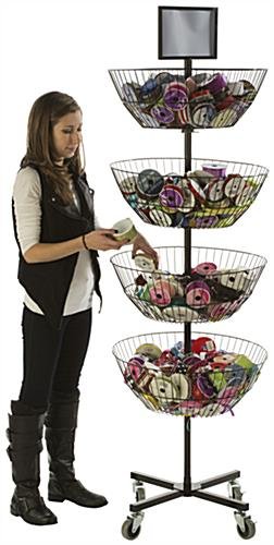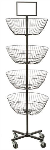 This 4 tier basket stand provides a decorative wire display with large round open top bins to hold an abundance of merchandise. Whether each floor standing unit is utilized to showcase garden essentials, home accessories, produce, fruit, or retail products the compartments rotate individually allowing multiple parties to view items at once. Assembly for the basket stand display is quick and easy, creating a knock down rack that can be packed and stored when not in use. Optional casters are provided with 2 locking wheels, as well as 4 levelers if a more stationary decorative wire unit is desired. Direct attention to deals, discounts, and specials for customer’s to browse with a removable top header. Create a unique display that allows clients to sort through products within each black bin which spins individually on each basket stand.