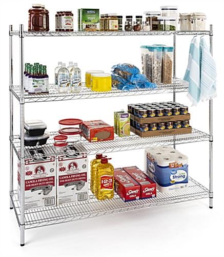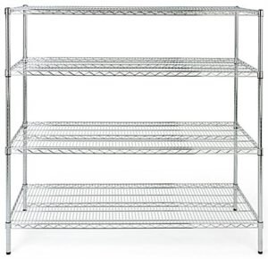 This chrome commercial wire rack shelving is ready to handle all your high quantity and heavy load storage needs. The NSF certified industrial grade display features four heavy-duty 24” deep tiers, 16 clips that make these levels adjustable, 1.20” pole frame, and protective plastic feet. Use this commercial wire rack shelving in a variety of settings, including kitchens, storage rooms, garages, and retail spaces. With a weight capacity of 330 lbs per tier, this display offers plenty of space for anything you want to keep off the floor but still within reach. Optional locking wheels and acrylic insert (sold separately), make this industrial grade storage unit transportable and allows you to store small merchandise. Let this commercial wire rack shelving with chrome finish organize and simplify your work environment.