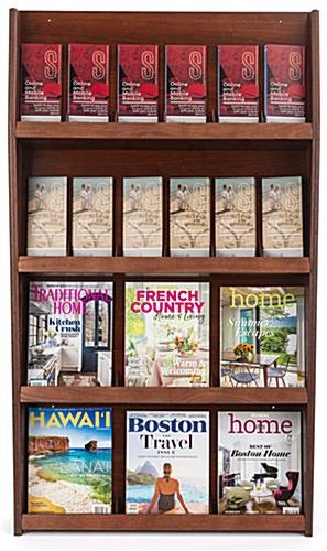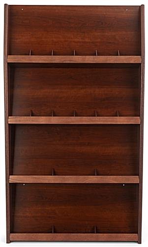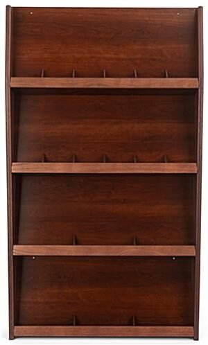 These wall mount magazine shelves are made from solid oak with an attractive mahogany finish to match waiting rooms and lobbies. Each of the four tiers features enough space to hold up to three stacks of 8.5×11 catalogs or six stacks of 4×9 brochures. The wood magazine shelves’ open design makes it easy for patients or visitors to take whatever they want. Whether you’re featuring promotional materials or monthly periodicals, they’ll be easy to see and ready to take. Easily install the mounted literature shelves with the included hardware and the pre-drilled holes on the back. Choose this wood display to give a warm feeling to any room while providing a space for reading material.