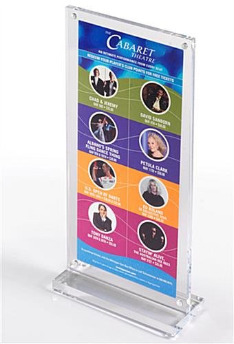 Each 4×9 acrylic picture frame is constructed with two 3mm thick clear plastic sides that attach together with small magnets. The desired photo can be slid in between these sides and secured in place using these magnets. This menu holder, acrylic picture frame, is equipped with a base that measures 10mm tall by 50mm wide. This bottom allows the plastic enclosure to stand up right in a steady manner. This acrylic picture frame, also called a brochure holder, presents images in portrait orientation. This orientation is ideal for presenting marketing materials in stores and at tradeshows. This acrylic picture frame that is 4” x 9” holds many kinds of materials in an easy to see up right manner.