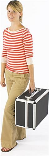 These portable exhibit displays feature aluminum constructions with matte black finishes. The body is made up of three literature pockets that fold out in an “accordion-like” mechanism and easily lock into place. Use these pockets to hold magazines, catalogs, and other informative literature. The tabletop is made of a wood laminate that folds in for storage and measures 20″ x 14-1/2″. The entire portable table folds into a compact design that easily fits inside of the case. There are a huge selection of portable display products for all your need.