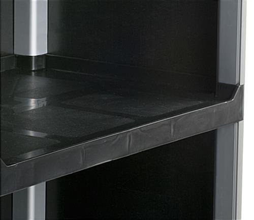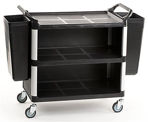 This bus cart and accessories that attach to the handles provides a convenient tool for bussing tables or other public areas. The trolley includes two trash bins that can be easily removed to dispose of waste. The shelves of this bus cart and accessories have a textured surface to prevent items from slipping when being transported. The caster wheels swivel for easier maneuverability through narrow spaces or around corners. This bus cart with bin accessories is great for dining facilities, restaurants, hotels and schools.