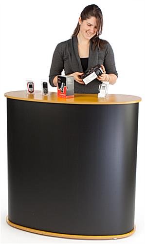 These exhibition counters provide an area for trade show exhibitors and attendees to interact. The furniture is also great for product demonstrations or as a “free sample” kiosk at retail outlets. The exhibition counters for sale here, also known as portable displays, can stand alone or be placed within an existing trade show booth. The black sidewalls with wood-grain base and countertop coordinate with many existing booth setups. These exhibition counters that include a convenient carrying system are versatile and designed to last for years. The displays are lightweight for easy transport between events.