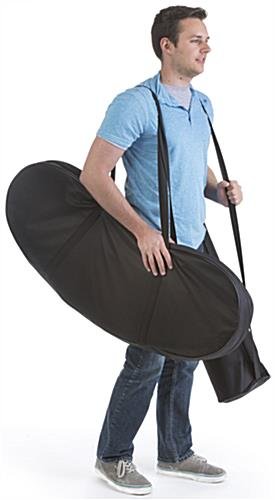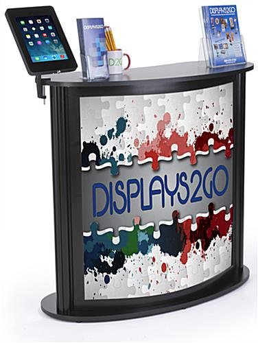This custom trade show counter with iPad stand is the ideal portable display for your next promotional event. Included with the unit is a tablet holder mount which attaches to the table top using clamp accessory. The trade show counter for marketing also contains two PVC lenses which protects your personalized graphics. The portable display packs up easily, just break down the assembly and store it away in the carrying bag for your next convention. Add versatility to your trade show counter with a tablet mount holder to show your consumers product information electronically. Place your floor standing vanity at the forefront of your next expo to get increased exposure and promotion!